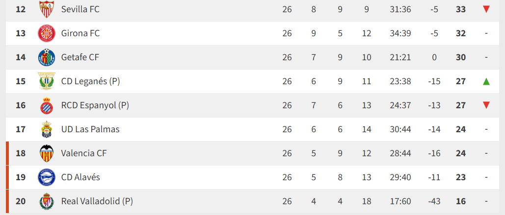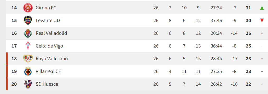 In terms of last 8 games’ form, Elche are bottom with 3 points, then, surprisingly, Espanyol with 5, followed by Oviedo and Sevilla with 6, then Mallorca with 7 and Alaves with 8. All of those, except Espanyol, are in the relegation mix. In the last 5 seasons the points needed for survival were 41, 34, 41, 39 and 35. With how bad a few teams are playing, this could be a season where a lower points total of 40 is enough so really anyone who can hit form for a few games will stay up.