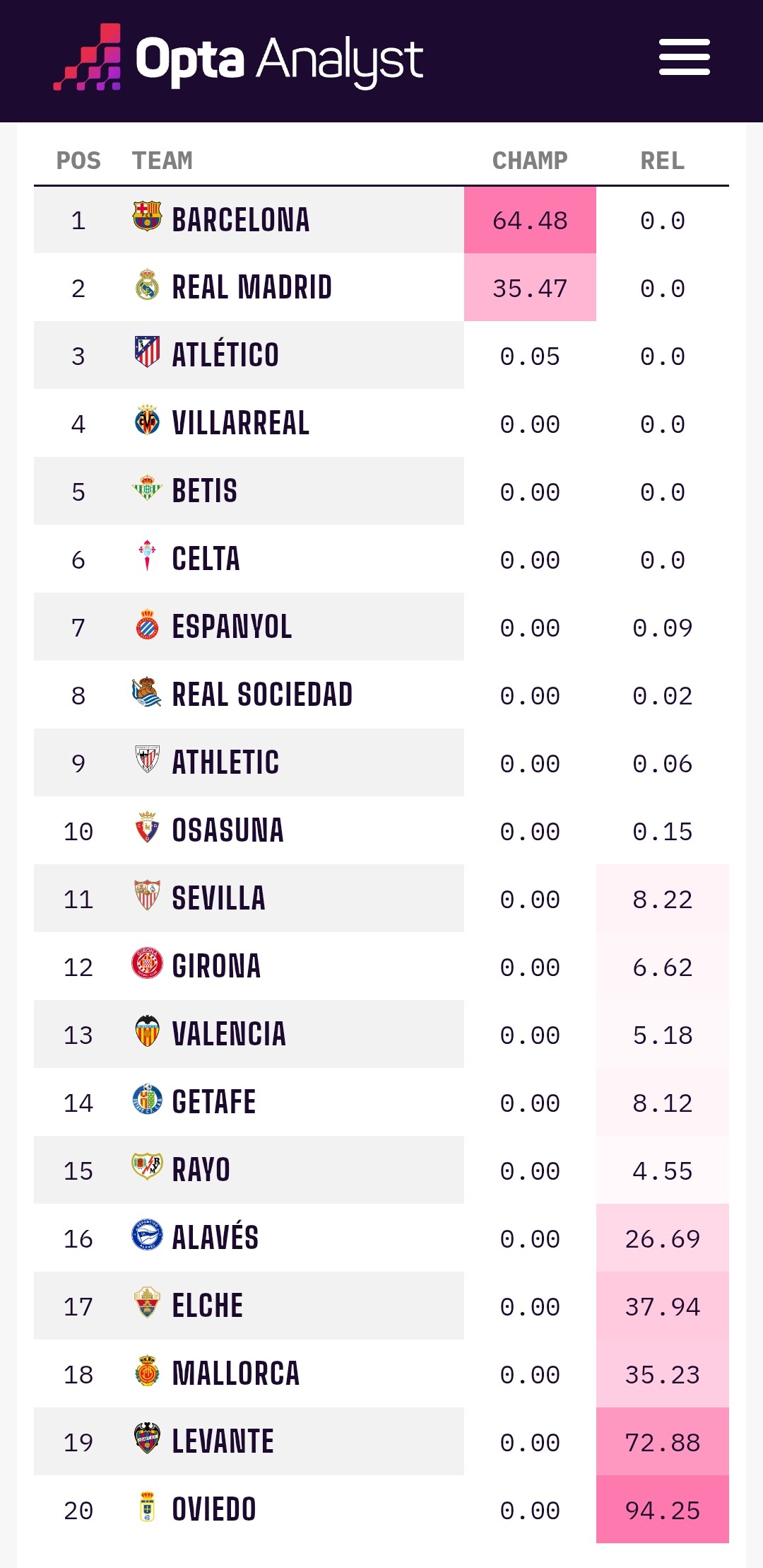 realistically it’s a case of win the next 2 home games (Rayo and Valencia, who’ve both been playing better) and the 2 away games after FCB (Levante and Oviedo.) 42 points = safe and season over. The only non-tough game after that set is Espanyol home, but better to go into May without a relegation sweat.